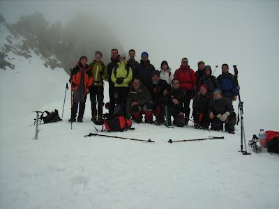 Són les 6:00 del diumenge; estem a 1920mts, mos esperen casi 1400 de desnivell positiu que no està gens malament. Sortim una mica desperdigolats del parking, de seguida comencem a pujar per la sendera sense neu fins una mica mica més a dalt del refugi, a on els crampons es fan imprescindibles per a gairebé tothom (eh Pau…). Pujant pujant, per suaus però constants pendents abarrotades de gent, mos plantem a la base de la canal de la Rimaya. Ara ve la part més entretinguda de l’ascensió: la forta pendent de la canal, de no se quants º; i despres de la cresteta final fem cim (3308mts) a les 10 del mati. En total 4h caminant, contant parades. Per desgracia les fortes rafages de vent (potser 100km/h o més) i la boira no mos van deixar gaudir de les vistes a l’Aneto i a tot el massís.