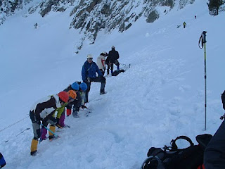Aquest cap de setmana hem fet la cloenda del V Curs de tècniques bàsiques de Muntanya a la Vall d’Aran. La jornada del dissabte la vam dedicar a formar els participants en les tècniques bàsiques d’alpisnisme: encordaments, tècniques per rapelar, escalada en gel i autodetenció. En quan se’n va anar el sol vam afanyar-mos a acabar les pràctiques i tornar-mo’n cap als nostres vehicles. Monitors i alguns cursetistes ens vam retrobar en un restaurant de la Seu per sopar on el bon ambient i les rialles (provocades pel vi???) van ser la tónica constant.