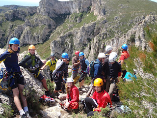 Ens hem trobat 16 atrevits liderats per l’immillorable guia Manolo ‘The Big’. Durant l’aproximació hem començat a calentar músculs. I lo bé que ha anat aquest pre-calentament, ja que ens esperava una paret amb desploms en tot moment. Al grup capdavanter anàvem la futura Edurne Pasaban: MªPau, Toni, Dani i Esteban. Ens seguien Lucy i Lucia, amb Carlos que no es despegava en cap moment d’elles, per si necessitaven ajuda o un ‘copet de mà’. Després venia el grup dels cracks: Montse, els Jordis, Obi,… i uns quants més. Tot seguit, el ràpel, que s’ha realitzat sense cap complicació, però la segona part de la via…ufff!! Crònica en primera persona: els desploms de la primera part els havia passat sense cap compilació i res em feia pensar que la paret que venia a continuació se’m resistiria d’aquella manera. Avant i atràs, avant i atràs. Els meus bíceps ja no responien i les veus de tota la collada al darrera veient-ho i dient: “els dos peus a l’escala!”, “un saltet i ja ho tens!”, “ vés més a la dreta!”… Res a servit. Una servidora, cansada, ha fet ‘saque’. Sort que m’havia assegurat bé. Tots han callat. De cop, una corda miraculosa a caigut del cel llençada pel Déu Manolo. No m’ho he pensat gens, un vuit i cap amunt. Els de darrera, per molt que diguin que estava xupat, també han patit. I qui digui el contrari menteix vilment.