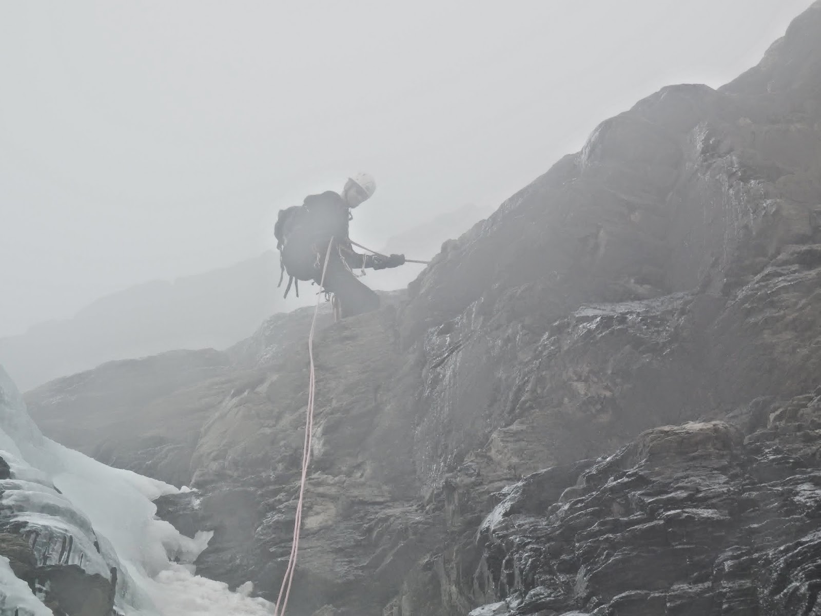 La pujada se fa dura, el pes de les motxilles i el desnivell constant ens apreta, progressem alternant entre neu i roca, fent les parades pertinents, fins que la neu passa a ser constant.