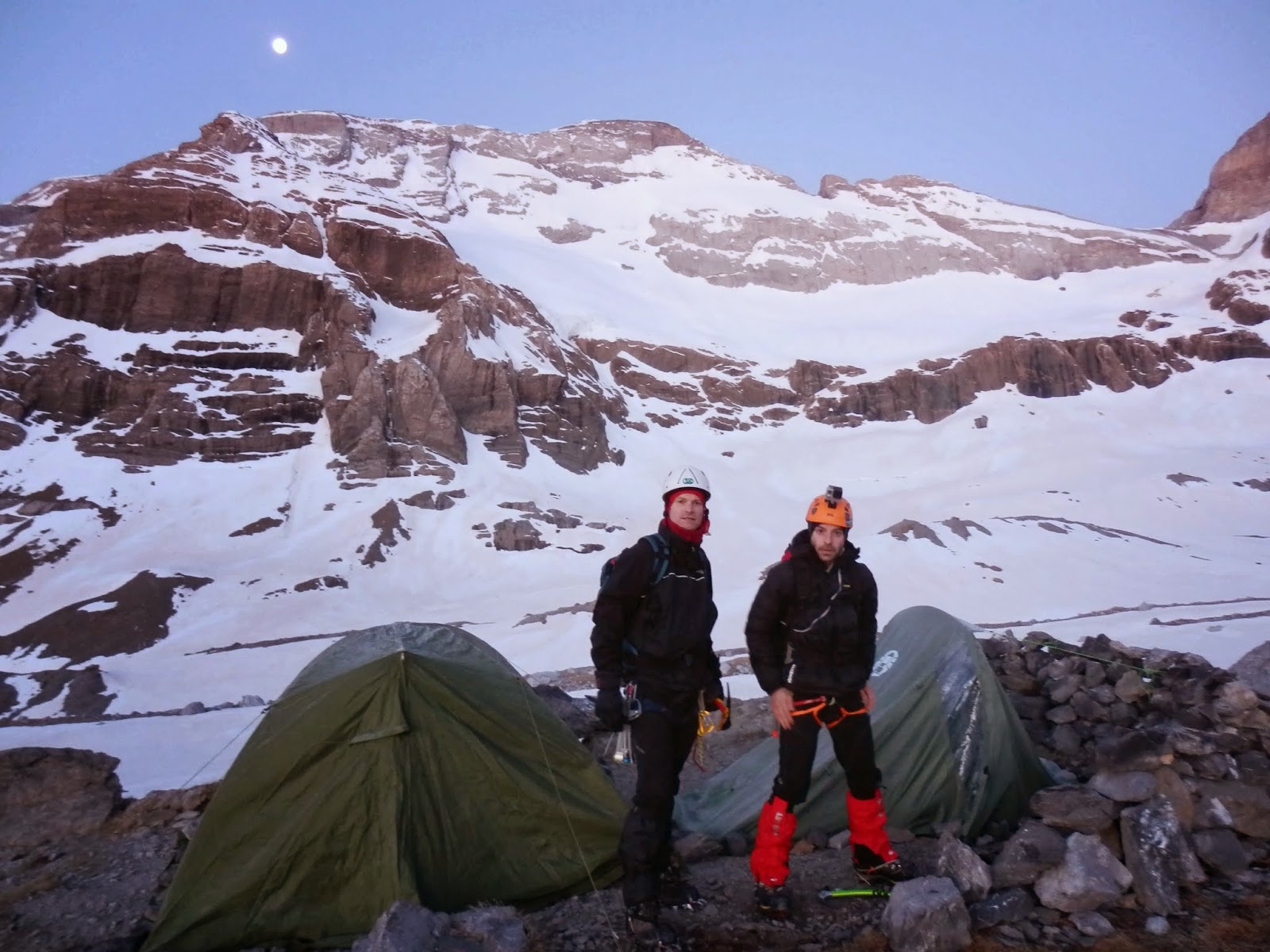 La pujada ens ha deixat amb poca aigua, començem a fondre neu i disfrutem de les vistes de la cara nord del Perdut, l’objectiu de demà.